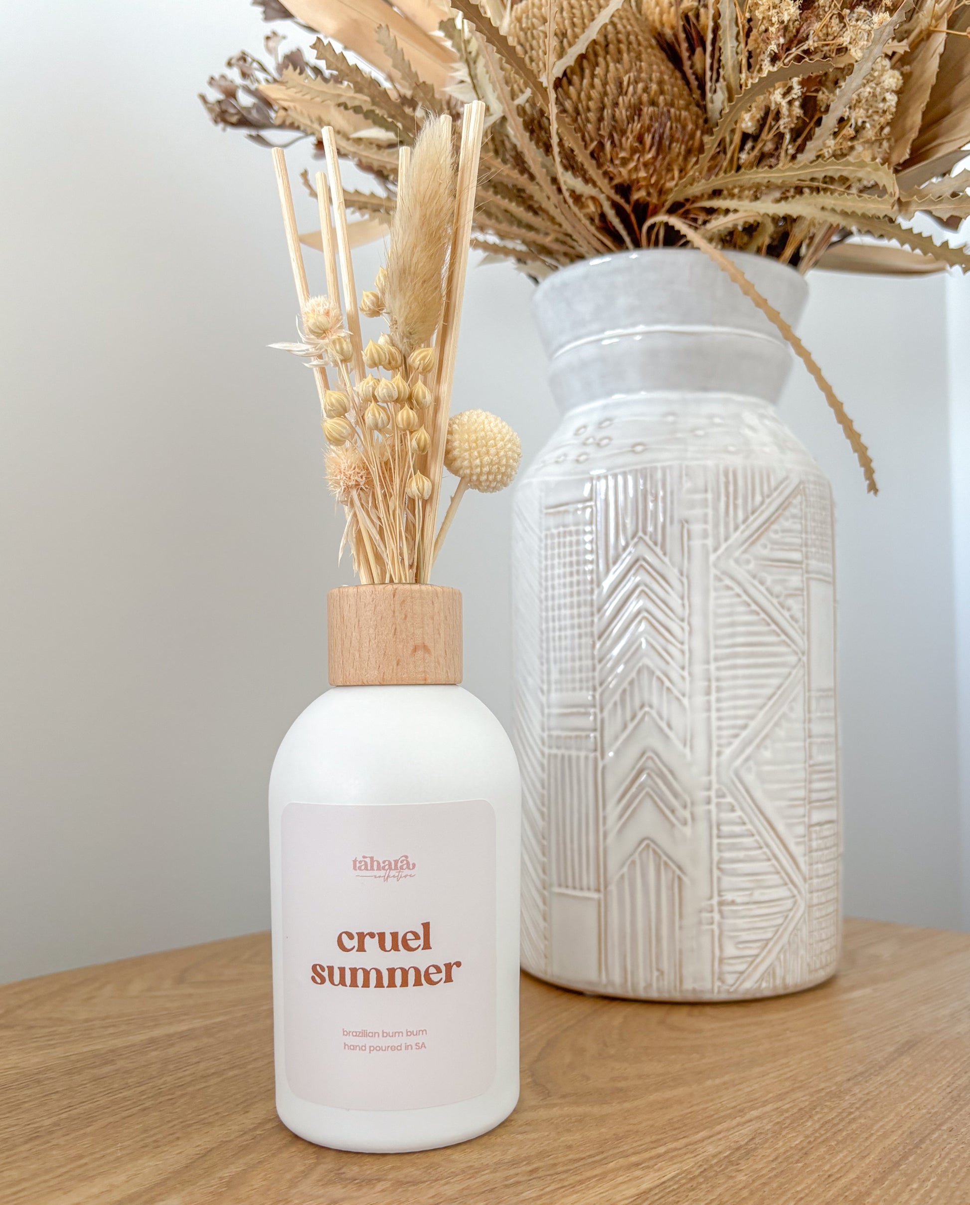 hand poured in a matte white bottle with a natural timber lid, natural reed diffuser sticks and an assortment of dried flowers