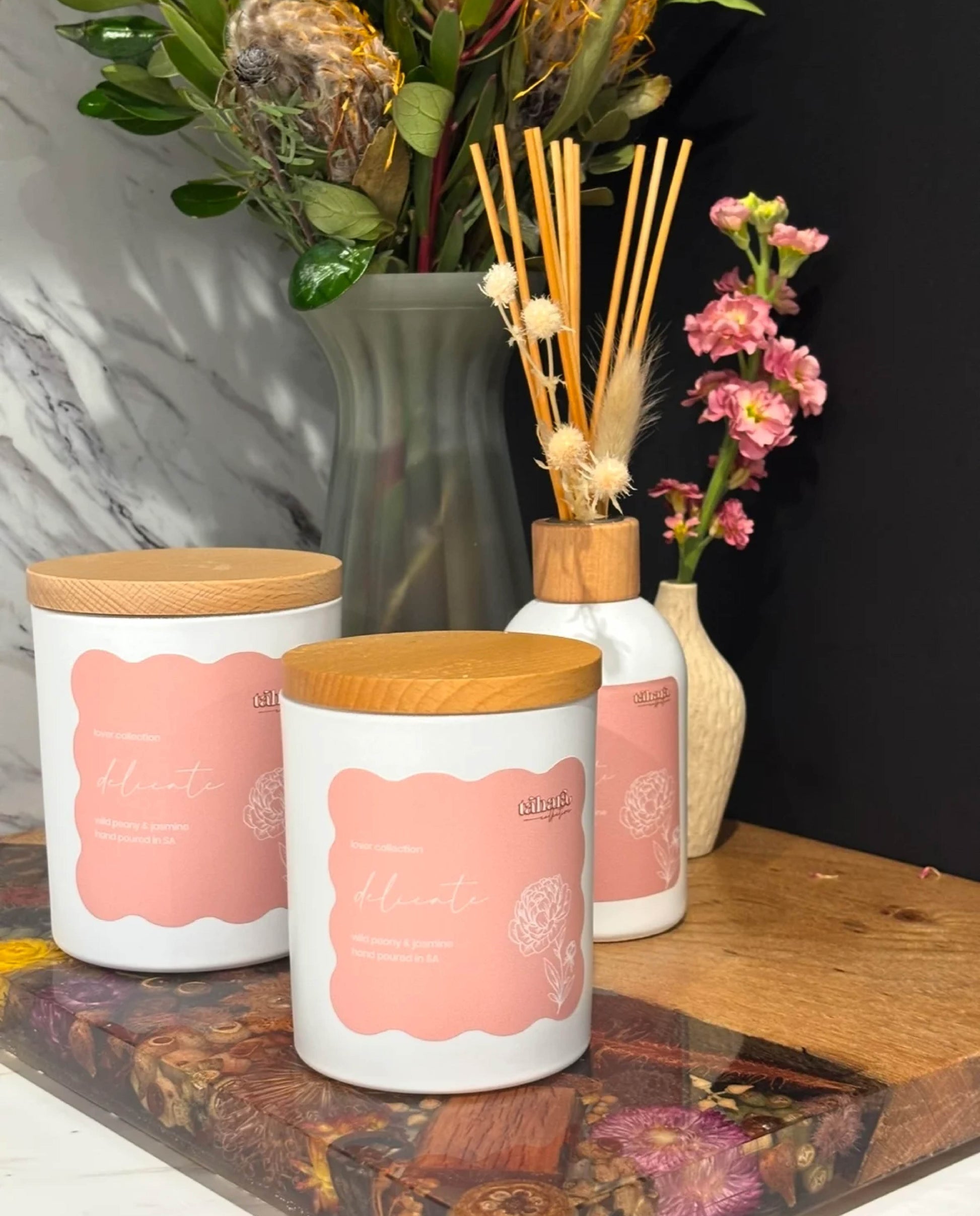 hand poured in a matte white jar with a timber lid and wavy woodwick