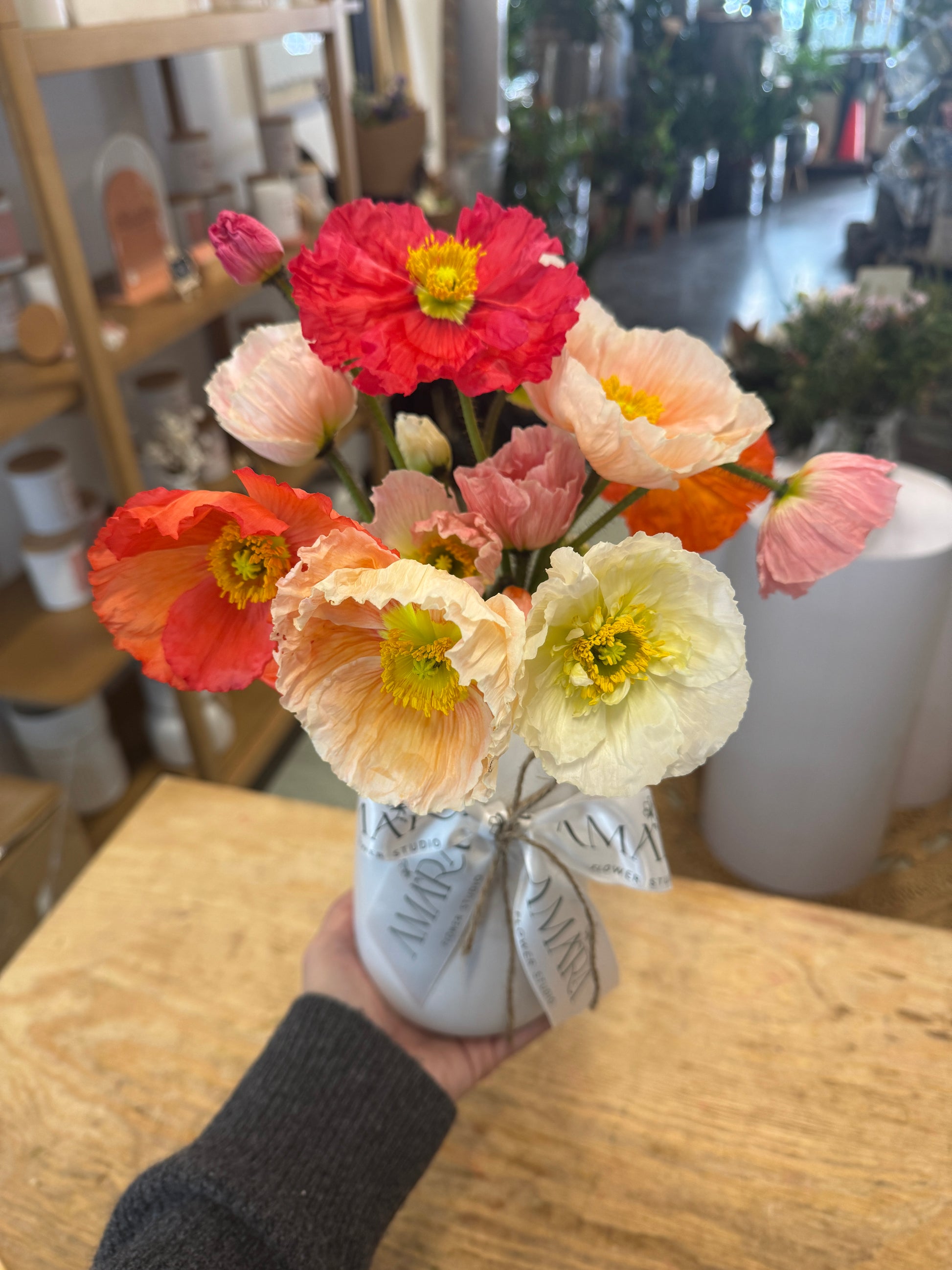 Each arrangement is hand made using seasonal blooms. You have the option of choosing from our signature colour range – neutral, pastel, vibrant, native or if you can’t decide there is a surprise me option. Our bouquets are wrapped in kraft paper and our arrangements are presented in a glass vase.