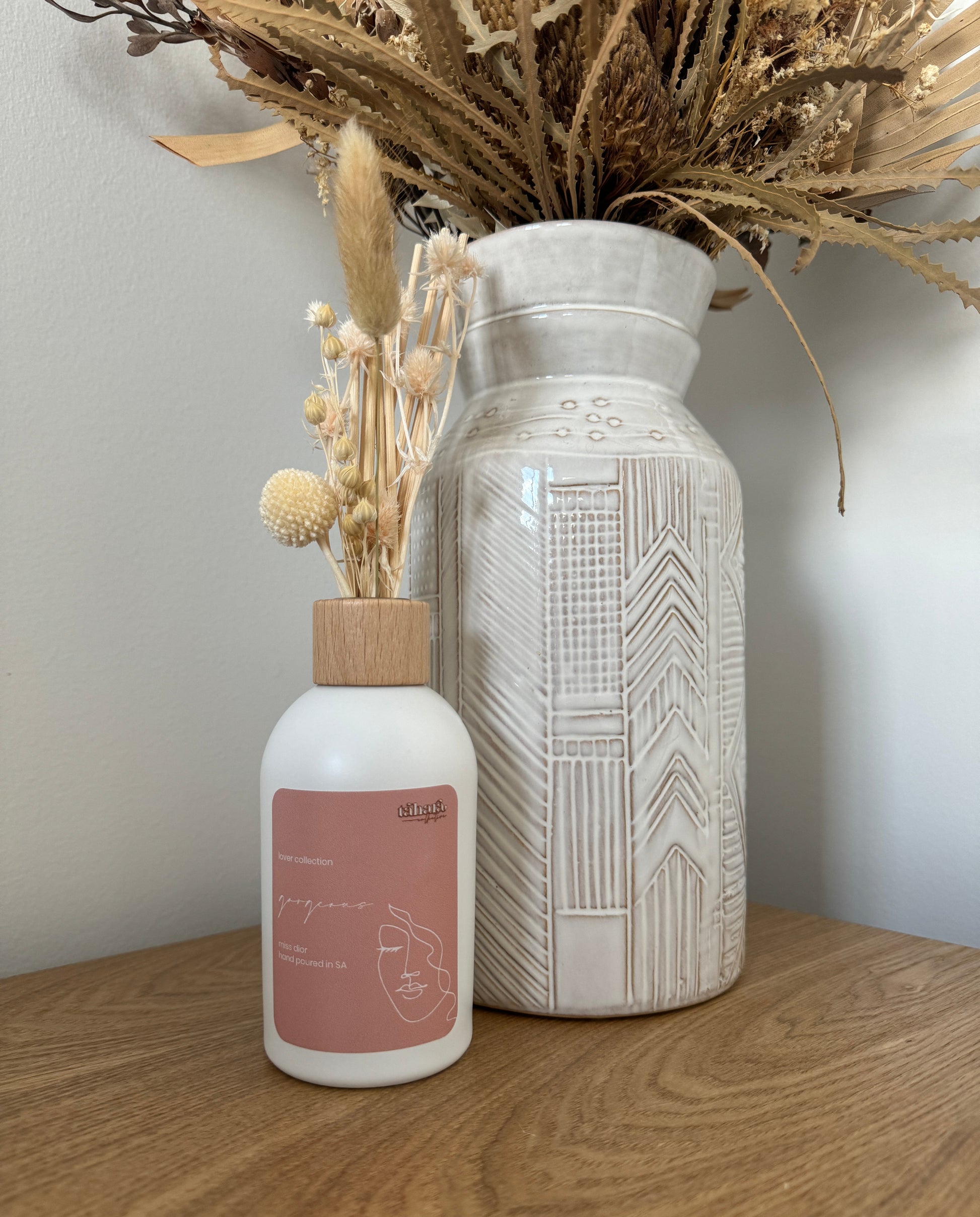 hand poured in a matte white bottle with a natural timber lid, natural reed diffuser sticks and an assortment of dried flowers