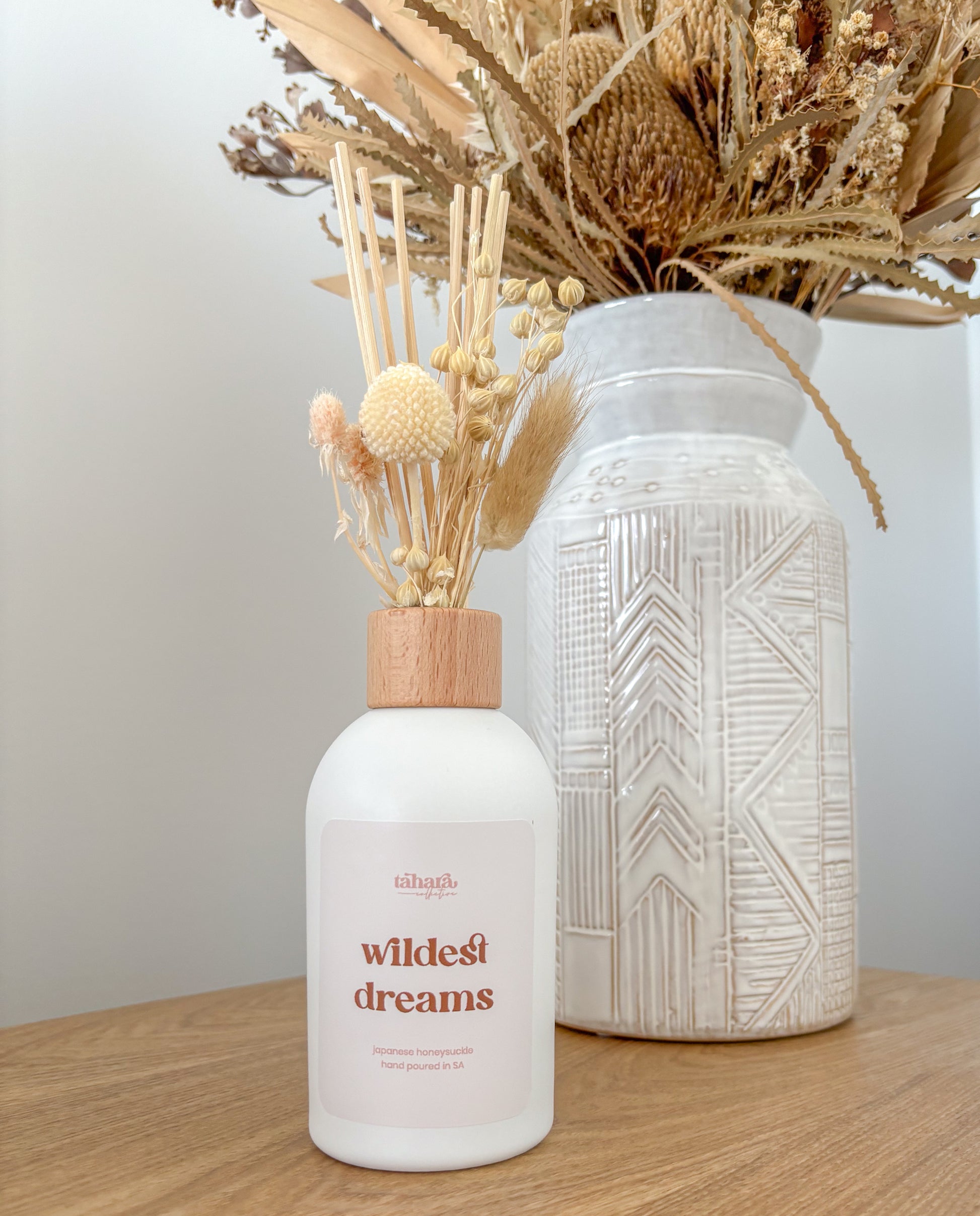 hand poured in a matte white bottle with a natural timber lid, natural reed diffuser sticks and an assortment of dried flowers