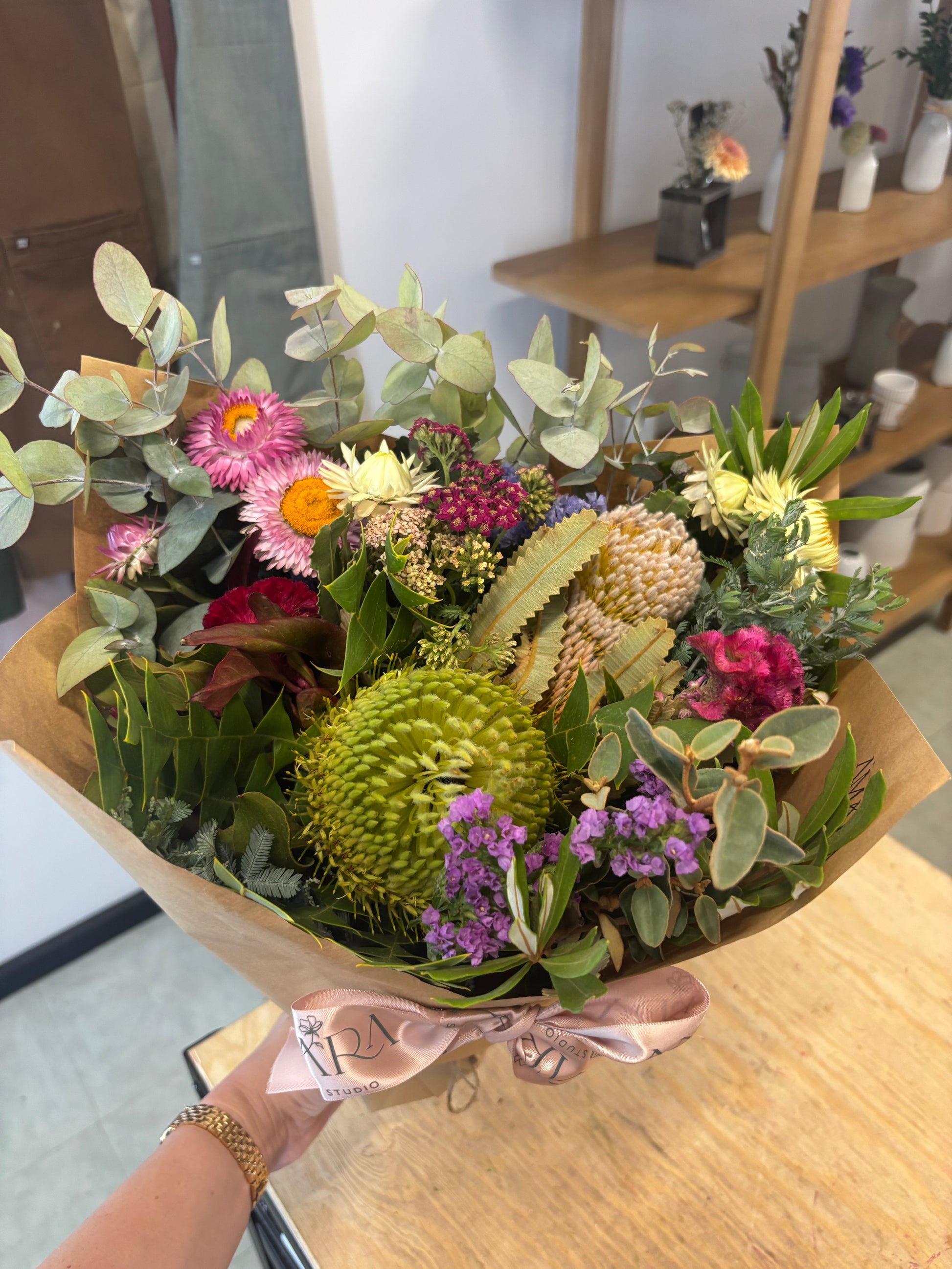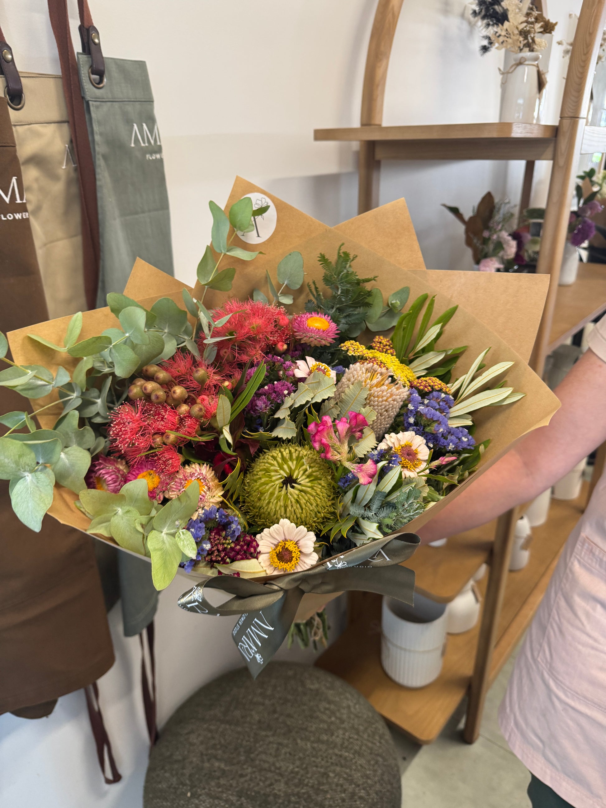Each arrangement is hand made using native blooms. Our bouquets are wrapped in kraft paper and our arrangements are presented in a glass vase.