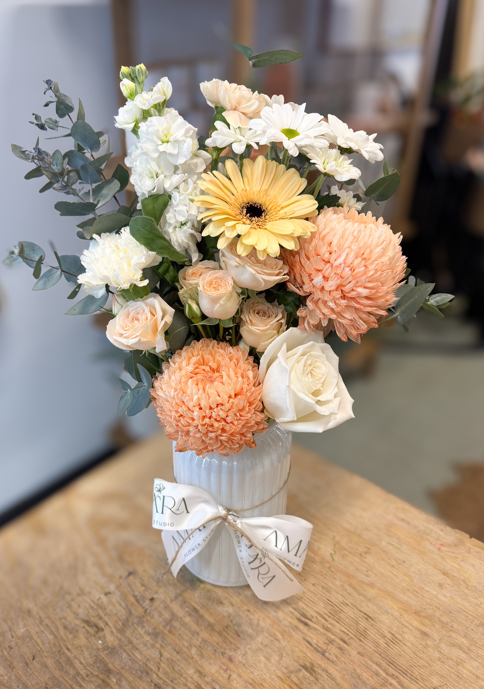 Each arrangement is hand made using seasonal blooms of white, taupe, grey and green. Our bouquets are wrapped in kraft paper and our arrangements are presented in a glass vase.
