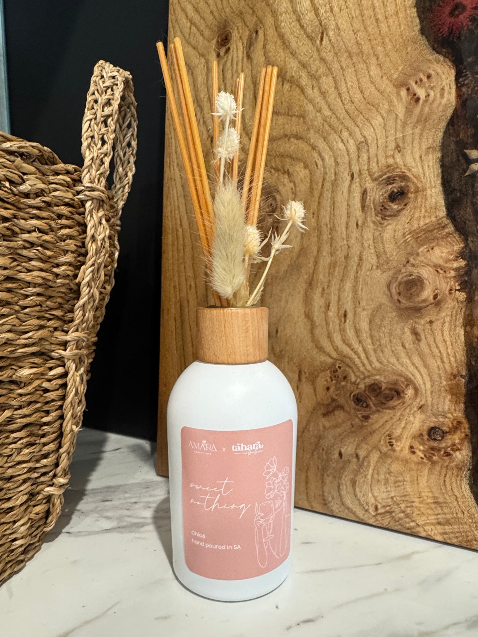 hand poured in a matte white bottle with a natural timber lid, natural reed diffuser sticks and an assortment of dried flowers